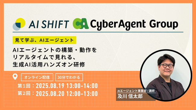 株式会社サイバーエージェント(本社:東京都渋谷区、代表取締役:藤田晋、東証プライム市場:証券コード4751)の100%子会社で、AIエージェント・生成AIリスキリング支援を提供する株式会社AI Shift(本社:東京都渋谷区、代表取締役社長:米山結人)は、企業における生成AI活用を推進するご担当者様に向けて、AIエージェントの構築方法・利用方法を“実際に見て”学べる研修セミナーを開催いたします。