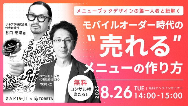 株式会社トレタ(本社:東京都渋谷区、代表取締役 CEO:中村 仁)は、2025年8月26日にオンラインにて「モバイルオーダー時代の"売れる"メニューの作り方」セミナーを開催いたします。ゲストには500社以上のメニューディレクション実績を持つメニューブックデザインの第一人者、サキアジ株式会社代表取締役 谷口泰崇氏を迎え、「オーダーコントロール」の哲学をモバイルオーダーに実装し売上を最大化する方法を初公開いたします。さらに、応募者の中から抽選で無料コンサル権をプレゼントいたします。