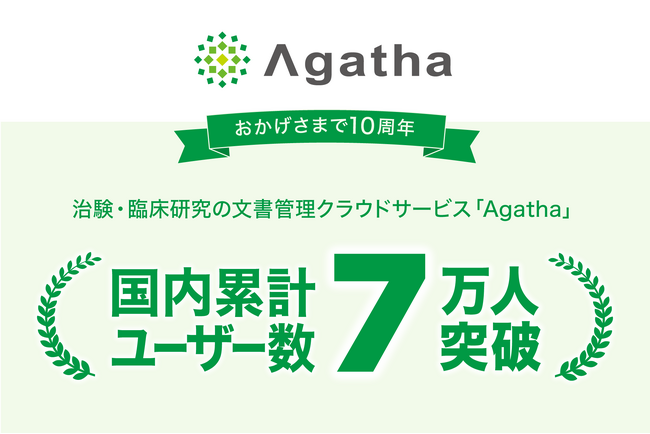 アガサ株式会社(本社:東京都中央区、代表取締役社長:鎌倉千恵美、以下「当社」)は、当社が提供する治験・臨床研究に特化したDXクラウドサービス『Agatha(アガサ)』において、ユーザー数が7万人を突破したことをお知らせいたします。現在、国内で治験を実施する医療機関の約66%(※1)、製薬企業においては約80%のお客様に「Agatha」をご利用いただいております。