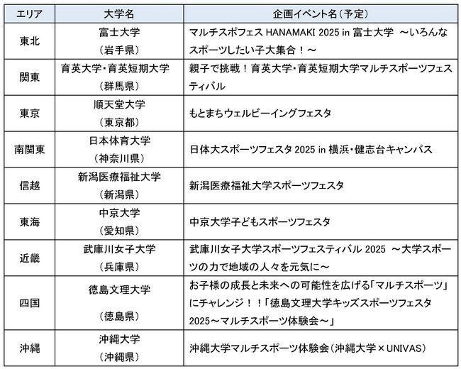 一般社団法人大学スポーツ協会(所在地: 東京都千代田区、会長: 福原 紀彦、以下「UNIVAS」)と日本郵政株式会社(本社: 東京都千代田区、取締役兼代表執行役社長: 根岸 一行)は、2025 年6 月に立ち上げた『大学スポーツの力で地域の人々を元気にする「マルチスポーツ体験イベント」公募型支援プログラム』における公募に関して、厳正なる選考の結果、9 エリア9 大学の企画が採択されましたことをお知らせいたします。