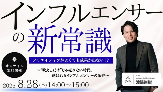 株式会社A(https://acetokyo.com/)は、インフルエンサー施策にこれから取り組むマーケターに向けて、『クリエイティブがよくても成果が出ない!?インフルエンサーの新常識!~“映えるだけ”じゃ売れない時代。選ばれるインフルエンサーの条件~』を、8月28日(木)にオンラインで開催いたします。