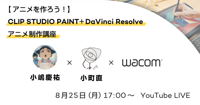 株式会社ワコムは、2025年8月25日(月)17:00より、「【アニメを作ろう!】CLIP STUDIO PAINT+DaVinci Resolve アニメ制作講座」を開催します。ゲストにアニメーターの小嶋慶祐さんと、DaVinci Resolve認定トレーナーの小町直さんをお迎えし、アニメーション制作アプリ「CLIP STUDIO PAINT」で描いたアニメを動画編集ソフト「DaVinci Resolve」でコンポジット/編集して仕上げるまでの流れを、プロならではの視点でわかりやすく解説いただきます。