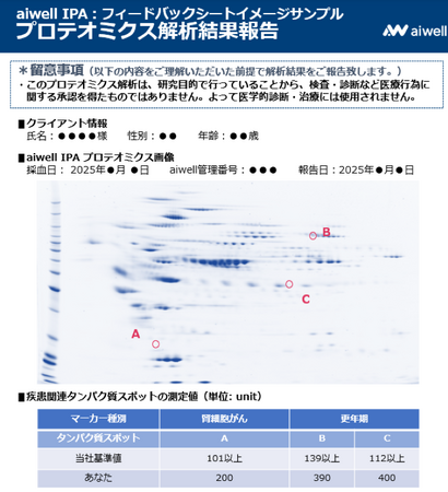 AIを用いたタンパク質バイオマーカーの迅速探索技術「aiwell IPA」を提供する東京科学大学認定ベンチャー称号授与企業のaiwell株式会社(本社:東京都千代田区、代表取締役:馬渕 浩幸、以下「aiwell」)は、当社で発見した「腎細胞がん・更年期症状のバイオマーカー」をもとに、モニター21名へ微量採血のプロテオミクス質解析結果のフィードバックを開始致しましたのでお知らせいたします。