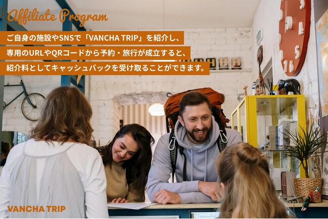 ご自身が経営されている宿泊施設や飲食店、ウェブサイトやブログ、SNSなどでVANCHA TRIPを紹介し、専用のURLまたはQRコードを経由して旅人がプランを予約・利用があると予約プラン額の数%をキャッシュバックとして受け取ることができます。サービスの詳細はこちらから