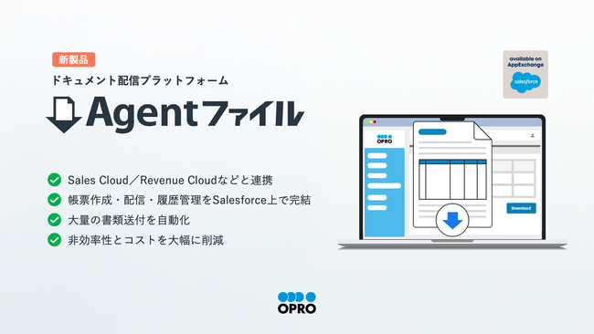 オプロは本日、Salesforce AppExchange上でドキュメント配信プラットフォーム「Agentファイル」を発表しました。これにより、お客様がSalesforceのSales CloudやRevenue Cloudなどから、請求書や見積書、契約書などあらゆるドキュメントファイルの作成、配信、開封状況の確認までを完結できるようになり、大量に生じる非効率な書類送付作業を、コストを抑える形で大幅に業務効率化をできるよう支援します。