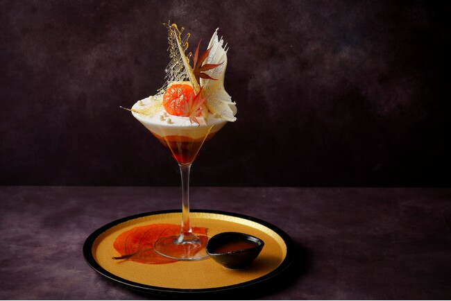 爽やかで程良い酸味がアクセントになる和歌山みかんと、秋の人気食材さつまいもの濃厚な甘さを掛け合わせ、見た目にも華やかなパフェに仕上げました。優しい口当たりのみかんとさつまいものエスプーマ、甘さが凝縮されたみかんのコンポート、香り高い川添紅茶ジュレのバランスの良さを楽しんでいただけます。 みかん風味のキャラメルソース がもたらす味の変化も是非ご堪能ください。