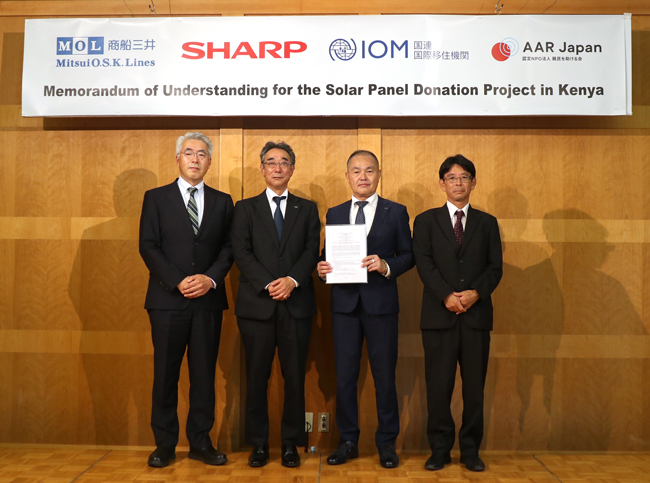 シャープ株式会社およびシャープエネルギーソリューション株式会社(※1)(両社合わせ以下、シャープ)は、ケニア共和国の無電化地域支援のため、海運大手の株式会社商船三井(本社:東京都港区 以下、商船三井)ならびに現地で活動する認定NPO法人「難民を助ける会」(以下、AAR Japan)(※2)と、第9回アフリカ開発会議(TICAD 9)(※3)に合わせて、太陽電池モジュールの寄贈に関する基本合意書を締結しました。