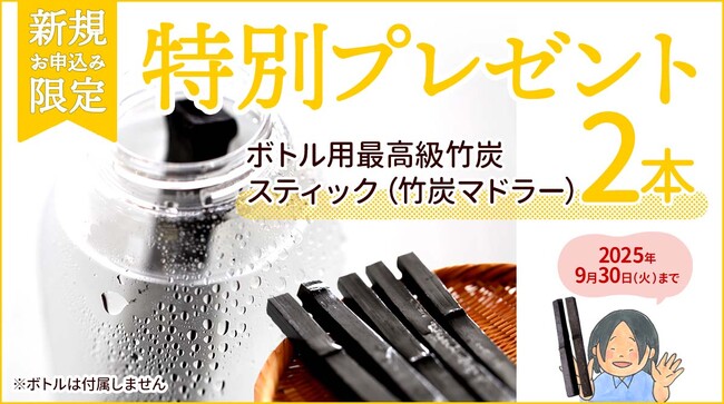 定期購入を新規でお申し込みいただいた方に、ボトル用最高級竹炭スティック(竹炭マドラー)2本をプレゼントする特別キャンペーンを9月30日までの期間限定で開始。お得で便利な定期購入をぜひお試しください。