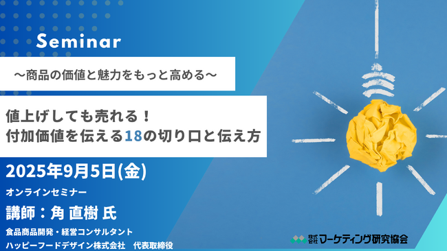 株式会社マーケティング研究協会は9月5日、オンラインセミナー「値上げしても売れる!付加価値を伝える18の切り口と伝え方~商品の価値と魅力をもっと高める~」を開催します。