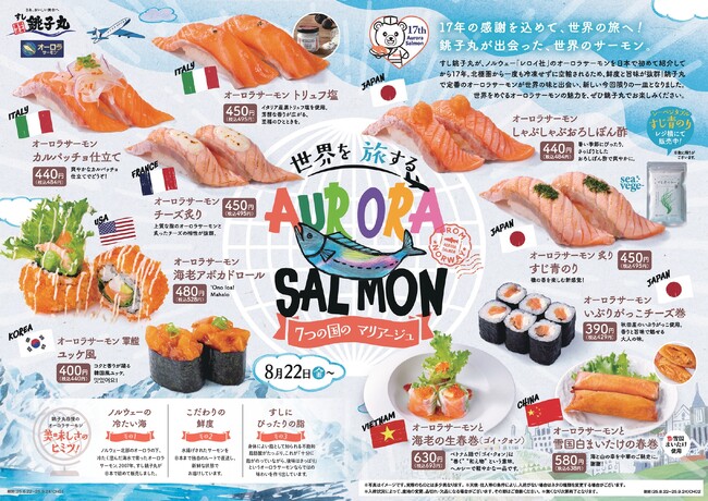 「真心を提供しお客様の感謝と喜びを頂く」ことを理念とする株式会社銚子丸は、2025年8月22日(金)より新イベント「世界を旅する AURORA SALMON & 秋のおすすめ」を開催いたします!