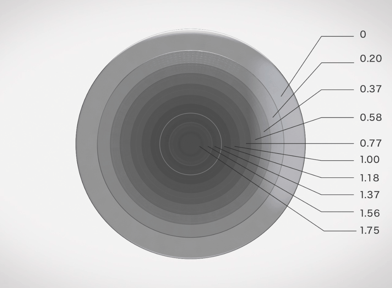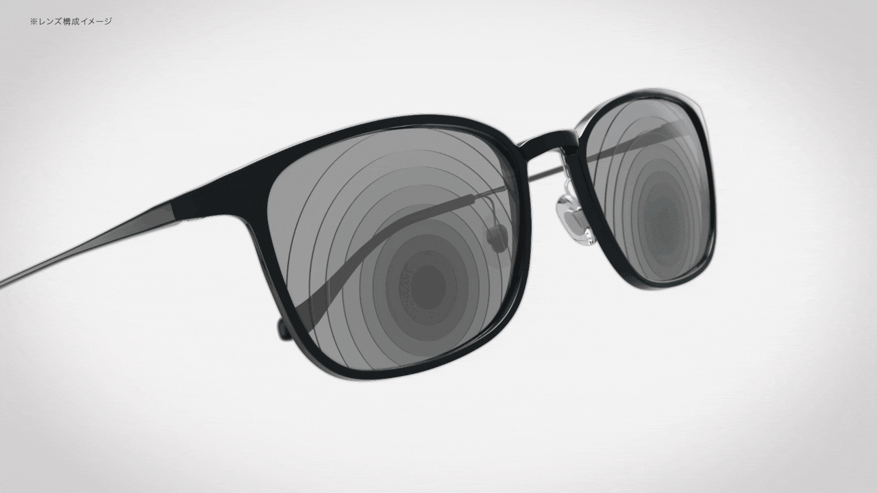 一般的な老眼鏡は単焦点レンズを採用しており、一定の距離でしかピントが合いません。一方で『Opt.1093(オプト イチゼロキューサン)』の累進多焦点レンズは、複数の度数が同心円状に配置され、中心度数【+1.75D】から外側に向かって徐々に弱くなる構造のため、様々な距離にピントが合わせやすくなります。