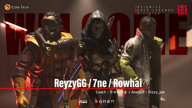 株式会社コアテック(本社:東京都目黒区)が運営するグローバルesportsチーム「REIGNITE」Apex Legends部門に、選手として「ReyzyGG」「Rowhai」「7ne」が、コーチ・アナリストとして「ちゃんりよ」「Dizzy_pw」が加入いたしました。