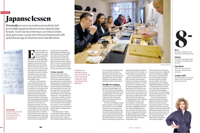 オランダの老舗紙『Het Parool』にて、レストラン評論家マラ・グリム氏は、「TEWATASHI」を「職人技が光る希少なおまかせ店」と高く評価。辛口としても知られる中で、当店は10ポイント中8ポイントという高得点を獲得しました。紙面では見開き1ページを割いて大々的に紹介されました。さらに記事内では、オランダではまだ珍しい日本の「OMAKASE」コースの意味や構成、その魅力に関して詳述。「TEWATASHI」のコースは、「家庭的な小皿料理から始まり、江戸前寿司、そして和牛すき焼きや手巻き、デザートのいちご大福が提供される」と紹介し、日本のすし屋のスタイルと文化を伝えました。
