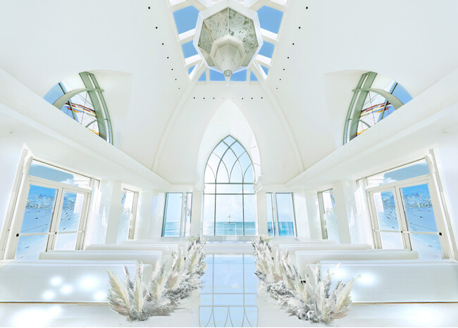 今回のリニューアルでは、「“空と海とハレ”が揃うコオリナで、わたしたちやゲストが等身大で過ごせるハワイ挙式」をコンセプトに、チャペルやパーティ会場から見えるコオリナの景色を堪能できるよう、ナチュラルでハワイの自然がやさしく包んでくれるような心地よい空間作りを目指します。チャペル内観はハワイの美しい自然との調和をテーマとしています。