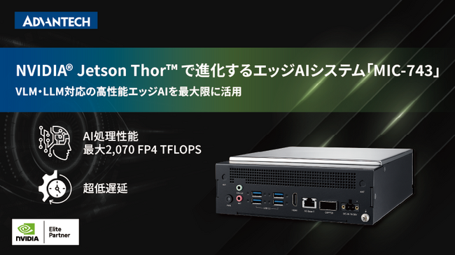 アドバンテック株式会社(東京都台東区、代表取締役社長 吉永和良)の本社 Advantech Co., Ltd(台湾、TWSE: 2395、以下 アドバンテック)は、NVIDIA(R) Jetson Thor(TM)を搭載した最新のAIエッジコンピューティングシステム「MIC-743」を発表します。