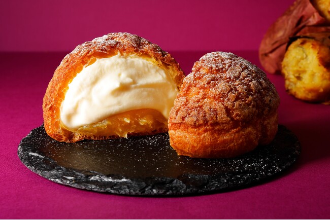 カマンベールチーズクッキーをのせて焼き上げたシュー生地にクリームを入れた期間限定のチーズパフです。しっかりした甘さが特徴の「紅あずま」のフィリングと北海道で作られたマスカルポーネチーズ、生クリーム、練乳で仕立てた焼き芋クリームに、さらに紅あずまのフィリングを加えました。