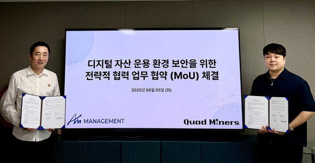 AMマネジメントは25日、韓国のサイバーセキュリティ専門企業クアッドマイナーと、デジタル資産運用環境の安全性と信頼性強化を目的とした戦略的業務提携(MOU)を締結したと発表した。