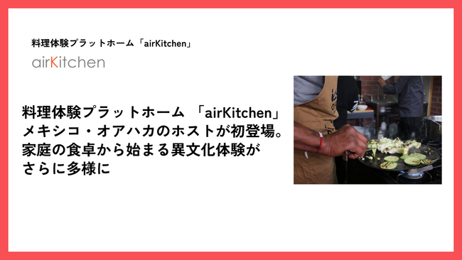 ZAZA株式会社(代表取締役:永津 豪、所在地:愛知県名古屋市)が運営する、旅行者と世界各地の料理体験をつなぐプラットフォーム「airKitchen(エアキッチン)」(https://airkitchen.me/host.php)に、初のメキシコ・オアハカ在住ホストが登場しました。オアハカの自然や文化と深く結びついた“ファーム・トゥ・テーブル”スタイルの料理体験が新たに加わり、airKitchenの体験の幅が一層多様に。料理を通じて地域の暮らし・環境・伝統と向き合う、新しい旅のかたちを提案します。