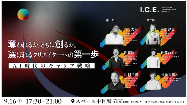「デジタルクリエイティブ業界の今を見すえ、魅力的な未来をつくる」というビジョンを掲げ活動する一般社団法人I.C.E. (Interactive Communication Experts|呼称:アイス|URL: https://i-c-e.jp/) は、2025年9月16日(火)に、~奪われるか、ともに創るか。選ばれるクリエイターへの第一歩~『AI時代のキャリア戦略』と題した I.C.E.セミナーを開催いたします。