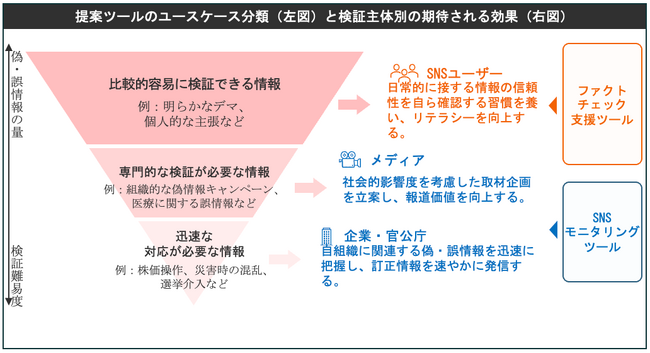 社会全体の情報検証能力を底上げ:検証が比較的容易な情報はSNSユーザーが自ら対応し、専門的な検証が必要な情報はメディアや企業・官公庁が担う、という検証難易度に応じた社会的な役割分担を促進します。これにより、情報発信側に比べて検証側のリソースが圧倒的に不足する「非対称性」という構造的課題の解決を目指します。