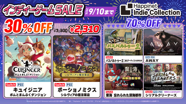 株式会社ハピネット(本社:東京都台東区、代表取締役社長:水谷 敏之、証券コード:7552)は、おもしろいインディーゲームを世界中からセレクトして発売するゲームレーベル「Happinet Indie Collection」タイトルのダウンロード版について、2025年9月10日(水)までセール実施することをお知らせいたします。「キュイジニア ポムとまんぷくダンジョン」が初の30%OFFにて販売など、全6タイトルが特別価格でお求めいただけます。