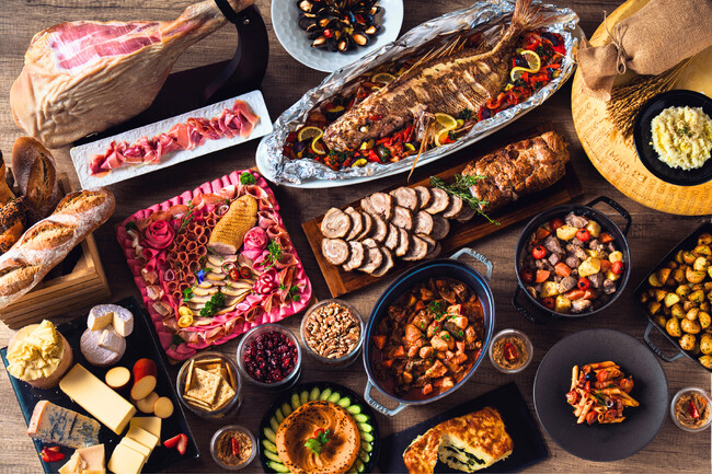 ゆっくりワインを嗜みながらお食事を楽しむヨーロッパの食事スタイルを体感いただけるよう、ビュッフェ台にはお酒に合うメニューが並びます。「チーズセレクション」には12か月熟成された「パルメザンチーズ」やミルクのコクが強く花びらのように削りながらお召し上がりいただくスイス産「テット・ド・モアンヌ」、塩味が際立つデンマーク産ブルーチーズの「デニッシュ・ブルー」などヨーロッパ各地から厳選した7種類の香り、食感、味の違うチーズをご用意いたします。多様な風味と食感を取り揃えた「シャルキュトリーセレクション」にはスペイン・ボナーリア社の塩味と旨味のバランスがとれた高品質生ハム「ハモン・セラーノ」の原木がビュッフェ台に登場。「スパニッシュチョリソー」や「モルタデラ」など5種類のシャルキュトリーが並び、スターターからヨーロッパの美食の世界へと誘います。
