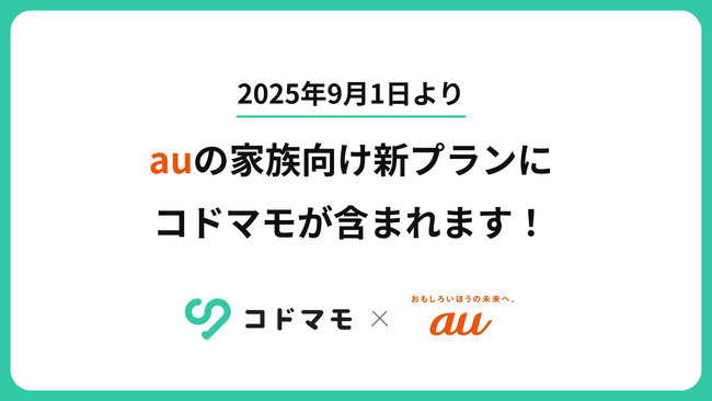 親子向けAIスマホアプリ「コドマモ」を提供するAdora株式会社(本社:東京都港区、代表取締役:冨田直人、以下Adora)は、KDDI株式会社(本社:東京都港区、代表取締役社長 CEO:松田 浩路、以下KDDI)が9月1日より提供開始する「U12バリュープラン」内において、コドマモのプレミアムプラン(通常月額790円/税込)が追加料金なしにて提供開始されることをお知らせします。これに伴い、全国に約2,000店舗有するauショップなど(※)をはじめとする、au取扱店での店頭案内・受付や、オンライン受付が9月1日より順次スタートします。