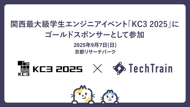 「テクノロジーを支える、全ての人のターミナルに。」を掲げるTechTrain(株式会社TechBowl 本社:東京都千代田区、代表取締役社長:小澤 政生、以下「TechTrain」)は、2025年9月7日(日)に京都リサーチパークで開催される「KC3 2025」にゴールドスポンサーとして協賛いたします。関西を代表する学生団体・学生エンジニアが一堂に会し、技術やキャリア、未来へのビジョンを共有する本イベント。私たちは、次世代を担う学生たちが仲間と共に挑戦し、新しい学びを得る瞬間に立ち会えることを誇りに思います。TechTrainは、これからも学生の挑戦を応援し、成長の機会を共に創り続けます。