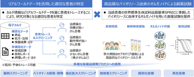 OrganoInsight(TM)は、京都大学医学部附属病院ほかアカデミア連携(注4)による患者さんの高品質なバイオリソースから作製したオルガノイドと、患者さんのRWDの活用による付加価値をペアリングしたサービスです。医療機関と密な協力関係を構築のうえ、診療情報などのRWDを基に患者さんをトレースすることにより、お客様のニーズに応じた(最適な患者かつ最適なタイミングの)高品質なバイオリソースに由来するオルガノイドを用いた創薬試験を提供します。