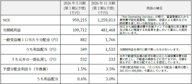 【ご注意】本資料に記載されている予想数値は、一定の前提条件のもとに算出した現時点の見込額であり、今後の賃借人の経営状況・財務状態の変動若しくは貸借人の異動等に伴う賃料収入の変動、予期せぬ修繕の発生等運用環境の変化、火災や災害等の発生による物件の状況への変化又は金利の変動等状況の変化により、前提条件との間に差異が生じ、その結果、収益及び分配金は大きく変動する可能性があり、その金額を保証するものではありません。また、本資料に記載されている予想期間及び以降の期間における分配金を保証するものではありません。