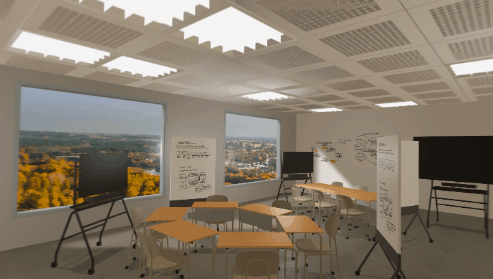 来場者はデバイスを装着し、空間全体を上空から俯瞰するような視点と、実際に教室内を教室内に居るかのような没入感のある視点の両方を体験。視点が自然に移り変わる構成によって、什器のレイアウトや動線、使用シーンまでを直感的に把握できる内容となりました。