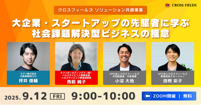 これを記念し、9/12(金) 9:00よりキリンHDのヘルスサイエンス事業部部長 西前純子氏、SagriのCEO 坪井俊輔氏をゲストに招き、「社会課題解決型ビジネスの極意」を紐解くオンラインイベントを開催します。参加費は無料です。ぜひ奮ってご参加ください。