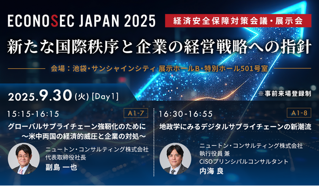 リスクマネジメントコンサルティングを手掛けるニュートン・コンサルティング株式会社(本社:東京都千代田区、代表取締役社長:副島 一也)は、9月30日(火)~10月1日(水)に池袋・サンシャインシティ展示ホールB・特別ホール501号室で開催される、「経済安全保障対策会議・展示会ECONOSEC JAPAN 2025」に出展します。また弊社代表取締役社長 副島 一也が有識者としてECONOSEC JAPAN実行委員会に参画します。