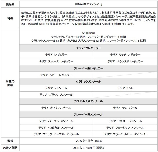 フィリップ モリス ジャパン合同会社(本社:東京都千代田区、社長:シェリー・ゴー、以下「PMJ」)は、加熱式たばこ IQOS ILUMA i (イルマ アイ)およびIQOS ILUMA(イルマ)専用たばこスティック「TEREA(テリア)」より、数量限定パッケージ「KIWAMIエディション」16銘柄を、2025年9月3日(水)より、IQOSオンラインストア、全国4店舗のIQOSストア※1 ※2、9月5日(金)より一部の免税店※1 ※3で順次発売します。また、全国のIQOSショップ(ヤマダデンキおよび、ビックカメラ一部店舗他)※2、全国のIQOSコーナー(ドン・キホーテ系列の一部店舗他)※2および、コンビニエンスストアを含む全国のたばこ取扱店では、2025年9月8日(月)から6銘柄、9月15日(月)から8銘柄、9月22日(月)より2銘柄の三段階に分けて順次発売します。※1 ※4