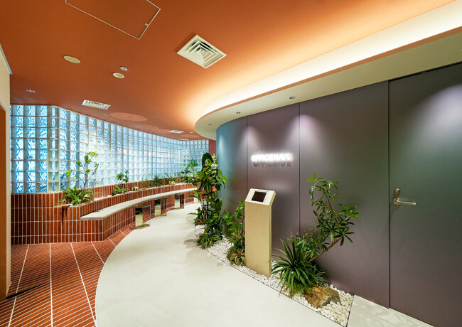また、空間に用いる素材も「繋ぐ」というテーマを体現しています。 レトロな趣を感じさせるガラスブロックやテラコッタ調タイルと、現代的なスチール調の素材という、 異なる時代・質感を持つ素材をあえて同じ空間で組み合わせることで、 異なるもの同士がひとつに結ばれ、新たな価値が生まれる“結び目”としてのオフィスを表現しました。