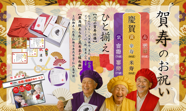 ~ 縁起物の紅白餅や宝舟昆布茶・ちゃんちゃんこ・末広・大黒頭巾・感動動画で彩る「賀寿お祝いひと揃えセット」新登場!~