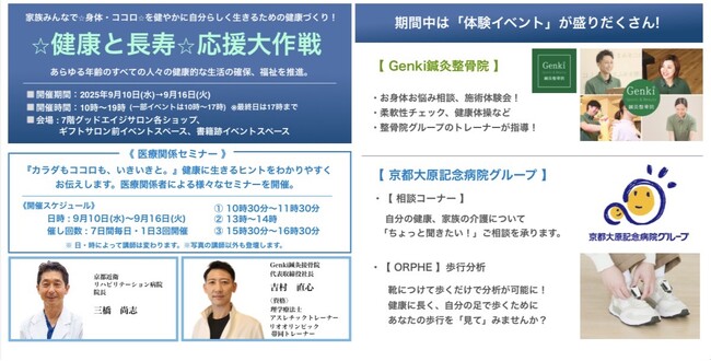 Genki鍼灸整骨院グループ(本社:京都府京都市、代表:吉村直心)は、2025年9月10日(水)から9月16日(火)まで京都大丸で開催される「健康と長寿☆応援大作戦」に特別参加いたします。本催事では、単なる健康イベントに留まらず、一日を通して「施術体験」「柔軟性チェック」「健康体操」など多彩なプログラムを体験いただけます。また、代表・吉村直心による特別セミナーも開催し、学びと体験の両面から“健康で痛みのない身体づくり”を応援します。