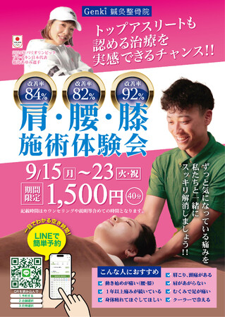 Genki鍼灸整骨院(本社:京都府京都市、代表取締役社長:吉村 直心)は、2025年9月15日(月)から9月23日(火・祝)まで、京都・大阪の全6店舗にて「肩・腰・膝 施術体験会」を開催します。本イベントでは、長時間のデスクワークや子育て、スポーツによる慢性的な痛みに悩む方々へ、オリンピック帯同経験を持つ理学療法士が監修した独自の施術を特別に体験いただけます。年間延べ4万人以上を施術し、トップアスリートからも信頼を得る当院の技術を受ける絶好のチャンスです。