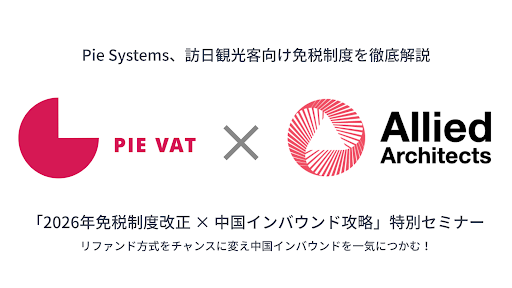 データとクリエイティブの力でマーケティングコミュニケーションを設計し、企業のマーケティングAXを支援するアライドアーキテクツ株式会社(本社:東京都渋谷区、取締役社長:村岡 弥真人)と、免税ソリューション「PIE VAT」及びデジタル免税カウンター「PIE VAT Station」を提供する株式会社Pie Systems Japan(本社:東京都中央区、CEO:水野 博商、以下「Pie Systems」)は、2025年9月18日(木)に 小売業向け・無料オンラインセミナー「リファンド方式と中国インバウンド完全攻略」特別セミナー」を開催いたします。