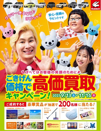 株式会社ラビット・カーネットワーク(本社:東京都江戸川区臨海町、代表取締役社長:山中 雅文)が運営する自動車買取・販売の「ラビット」では9月13日(土)~11月16日(日)まで『ごきげん価格で高価買取キャンペーン!』を実施いたします。