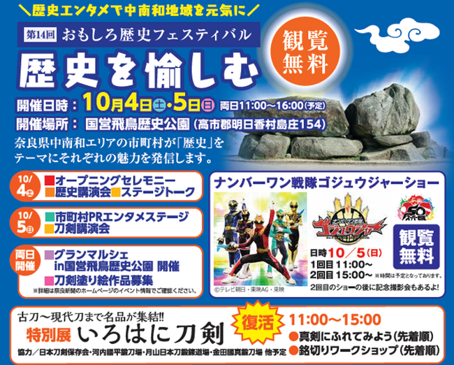 - 【人気の刀剣展示や体験も復活!】第14回おもしろ歴史フェスティバル「歴史を愉しむ」/10月4・5日の2日間、奈良県明日香村の「国営飛鳥歴史公園」に集まろう!09/26 13:40