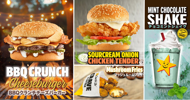 バーガーメニューとサイドメニューでは、ザクザクした食材をトッピングした食欲をそそる新メニュー3種が登場。本場アメリカのスモーキーベーコンを使用した「BBQ クランチチーズバーガー」や、揚げたてのチキンテンダーを挟んだ「サワークリームオニオンチキンテンダーサンドJr」。また「マッシュルームフライ」は、生マッシュルームを店内で揚げた日本オリジナルメニューで、ジューシーな旨味をよりダイレクトにお愉しみいただけます。
