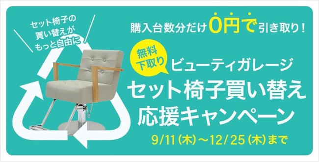 プロ向け美容商材EC最大手の株式会社ビューティガレージ(本社:東京都世田谷区、代表取締役会長兼CEO:野村秀輝)は、本日より期間内にセット椅子を購入した希望者を対象に、不要なセット椅子を無料で引き取る「セット椅子買い替え応援キャンペーン」を開始いたします。
