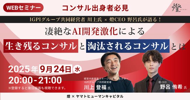ヤマトヒューマンキャピタル株式会社(本社:東京都千代田区、代表取締役:堀江 大介)は、2025年9月24日(水) 20:00よりオンラインにて、燈株式会社CEO 野呂 侑希 氏、株式会社経営共創基盤 マネージングディレクター IGPIグループ共同経営者 川上 登福 氏にご登壇いただくウェビナー『凄絶なAI開発激化による生き残るコンサルと淘汰されるコンサルとは』を開催いたします。