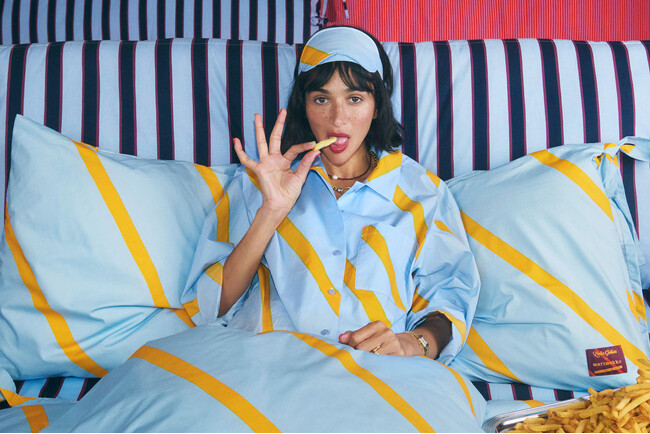 今回マリメッコのために、レイラが大胆なマリメッコの色彩と、マイヤ・イソラのアーカイブストライプを組み合わせた、ベッドルームアイテムのカプセルコレクションをキュレーションしました。