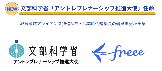 フリー株式会社(本社:東京都品川区、CEO:佐々木大輔、以下「freee」)は、文部科学省任命の「アントレプレナーシップ推進大使」に、フリー株式会社 教育領域アライアンス推進担当・起業時代編集長 磯貝美紀が任命されたことをお知らせいたします。