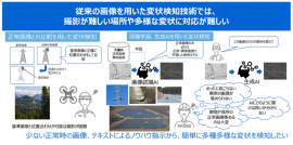 インフラ・プラントの設備点検へのAI導入は、危険な場所やへき地での現場の画像の取得が困難なことが、AI活用の障壁となっていました。従来、画像中の変状をAIで検知するには大量の現場画像の収集が不可欠でしたが、当社はこれまで、数枚の画像(正常画像)のみで、点検画像との比較で変状箇所を見つける画像検知手法「差分検知型画像異変検知技術(*1)」を開発してきました。この技術は、点検画像の撮影位置や角度が正常画像とずれていても高精度に変状箇所の検知が可能で、正常であるにも関わらず特徴的なパターンを異常として検知してしまう「過検知」も抑制することができます。しかし、背景や周囲の構造物が複雑な画像では過検知の抑制に限界があり、大量の正常画像の準備が再び課題となっていました。