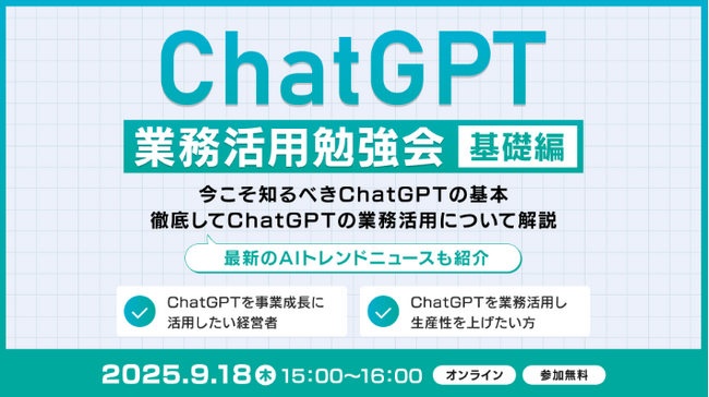 ChatGPTの基礎から、具体的なビジネス活用事例までを分かりやすく解説する勉強会を開催します。すでに400人以上が受講し、その効果を実感しています。ChatGPTをビジネスのインフラとして活用し、業務効率化を図りたい方は、ぜひご参加ください。