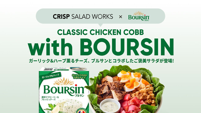 今回のコラボレーション商品は、クリスプサラダワークスで大人気の「クラシック・チキンコブ」と、フランス生まれのフレッシュチーズ「ブルサン ガーリック&ハーブ」を組み合わせた数量限定の特別なサラダです。クリスプサラダワークスの「クラシック・チキンコブ」に「ブルサン ガーリック&ハーブ」が加わることで、バターミルクランチドレッシングのクリーミーな風味と、フレッシュなチーズの濃厚かつ洗練された味わいやガーリックとハーブの豊かな香りが絶妙に調和し、コブサラダとしての満足感が一層高まるサラダに仕上がりました。