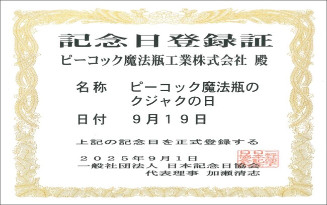 ピーコック魔法瓶工業株式会社(本社;大阪市、社長;山中千佳)は、当社の75周年記念事業の一環として、毎年の9月19日を、「ピーコック魔法瓶のクジャクの日」に制定し、一般社団法人「日本記念日協会」に記念日登録されましたことを報告いたします。